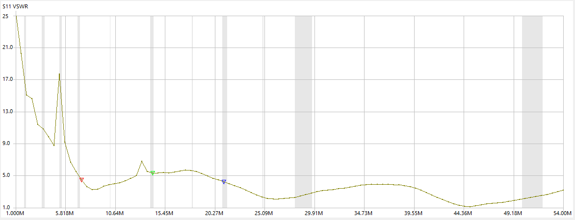 On HF my main interest is listening and DX, but when transmitting it is usually FT8, and for this the Rybakov vertical antenna is adequate for me and the size of our garden here. The performance is quite good and it is wideband from 40m to 10m bands. When combined with a tuner, it works fine for FT8. Note I only use the Rybakov for TX and loops for receive. Another plus is it's very cheap to build (<£100) and you can make it in a few hours. The VSWR plot below is measured in the shack and includes the 4:1 unun and 20m of Hyperflex 13 cable but excludes the ATU matching unit.